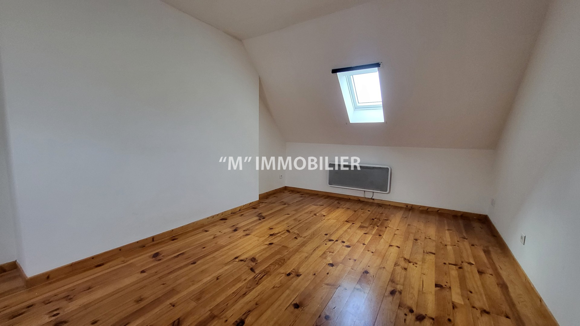 Le deuxième étage accueille une grande chambre mansardée, offrant un bel espace nuit ou bureau.