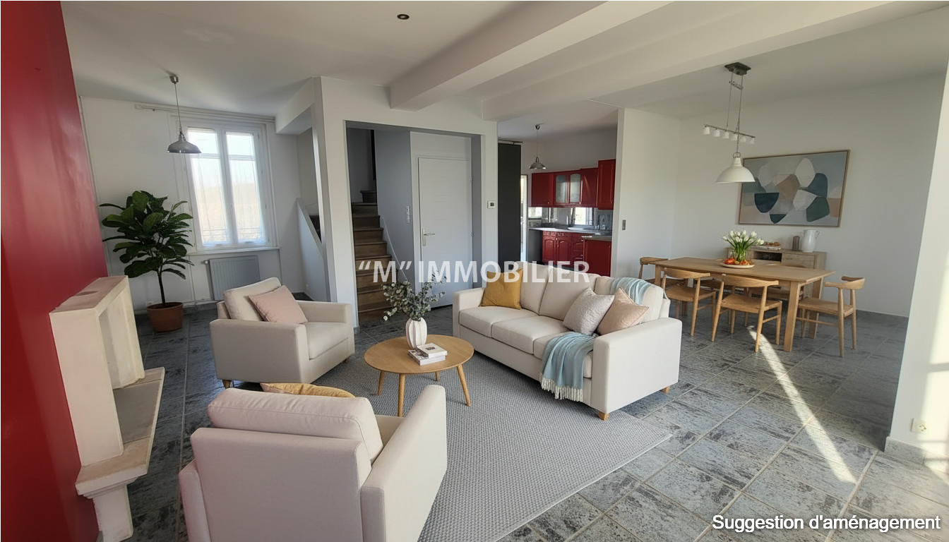 Édifiée sur un sous-sol total, la maison se compose au rez-de-chaussée d’un bel espace de vie lumineux avec un salon avec cheminée insert ouvert sur une cuisine entièrement équipée et aménagée, créant une atmosphère conviviale.Cet espace donne accès à une agréable terrasse, idéale pour profiter des beaux jours.