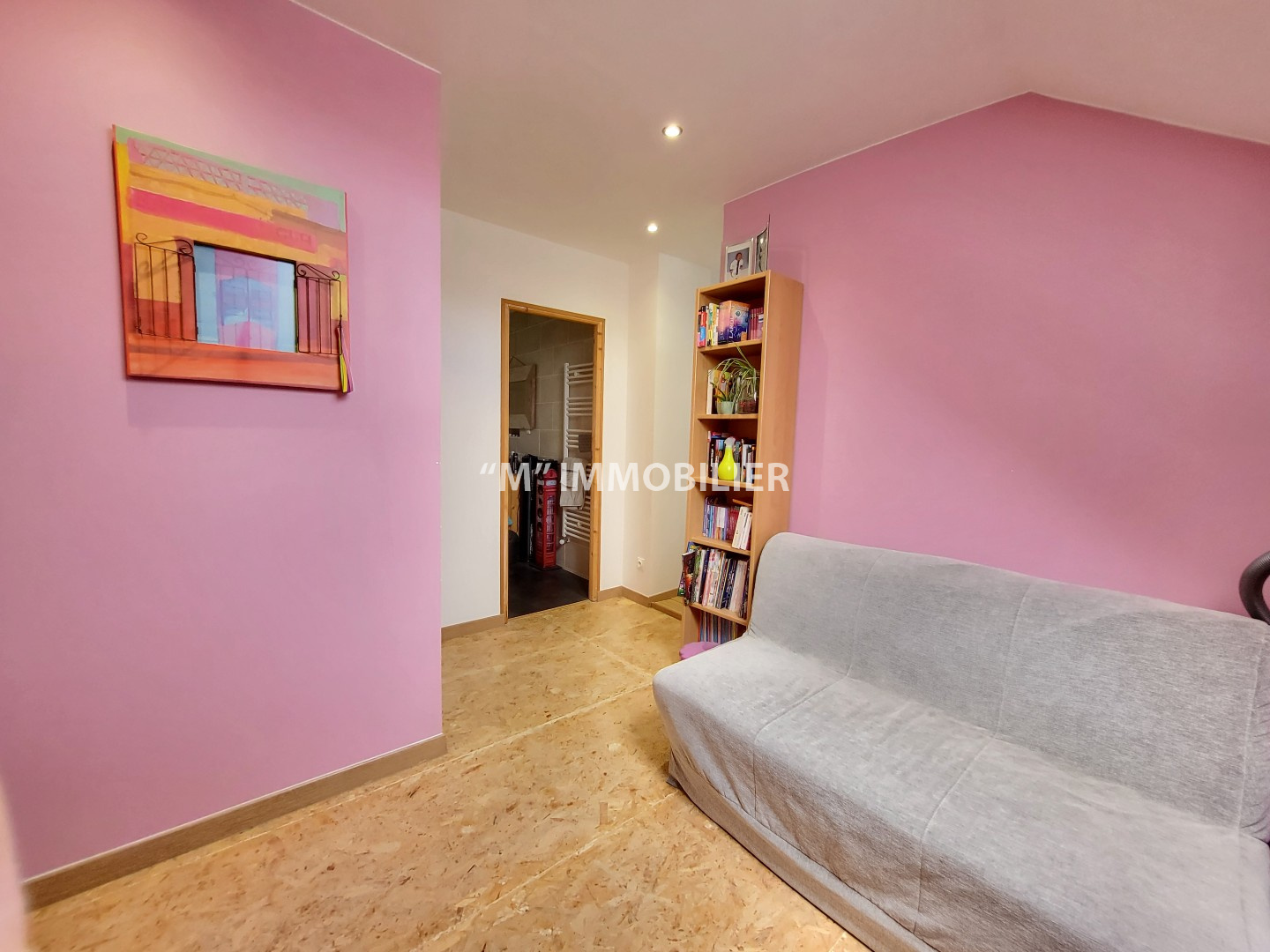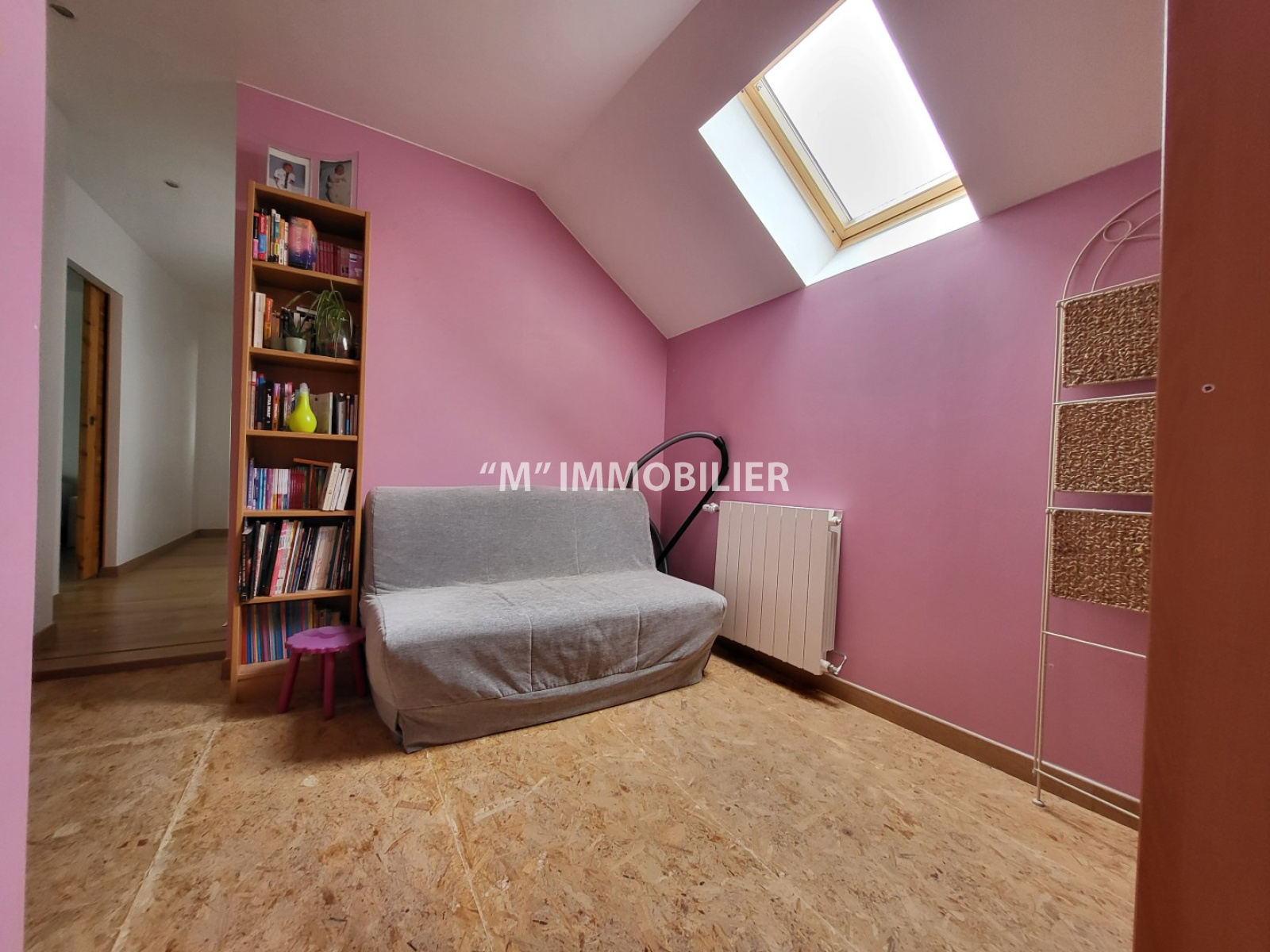 une grande pièce palière avec coin bibliothèque,